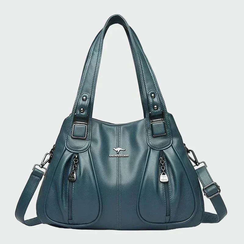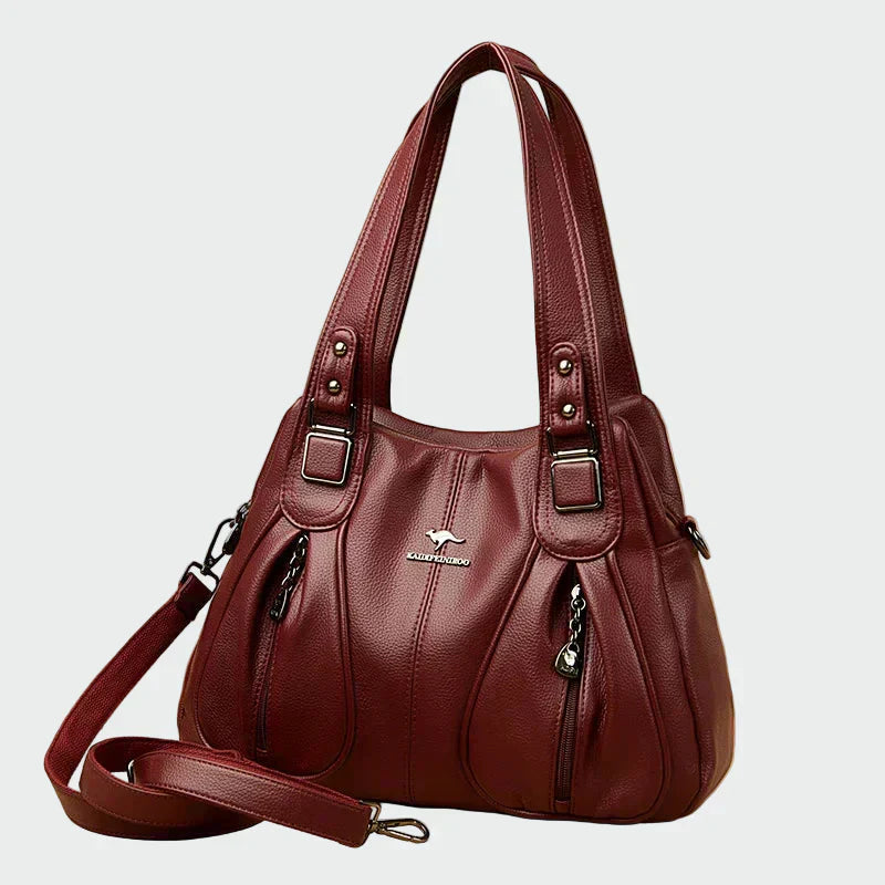 Impozantní dámská kabelka přes rameno v hluboké bordó barvě, navržená tak, aby poskytovala eleganci a pohodlí při každém vašem outfitu. Vyrobena z odolné vysoce kvalitní ekokůže, vyniká moderním designem a elegantními detaily na přední straně. Dvě dlouhé ucha umožňují pohodlné nošení na rameni, zatímco odnímatelný popruh nabízí možnost použití i jako crossbody. Vnější kapsy se zipem poskytují praktičnost a snadný přístup k nezbytnostem.