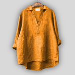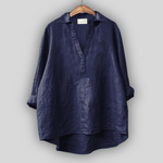 Elegantní lněná blůza v čisté bílé, která vyzařuje svěžest a nadčasový styl. Disponuje V výstřihem s diskrétní légu, dlouhými rukávy, které lze ohrnout, a asymetrickým zakončením s delší zadní částí, což zajišťuje pohodlí a volnost pohybu. Ideální volba pro chladné letní outfity nebo elegantní neformální vzhled.