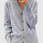 Pletený kardigan s výstřihem do V a mírně volným střihem. Žebrované lemy na rukávech a spodním okraji zajišťují stabilní tvar, zatímco zapínání na kovové knoflíky ve tvaru srdce dodává výrazný, ale čistý detail. Noste otevřený jako vrchní vrstvu nebo zapnutý jako svetr – od ležérního stylu až po kancelář.