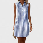 • Klasický pruhovaný vzor – Modro-bílé pruhy prodlužují siluetu a dodávají šatům nadčasový vzhled