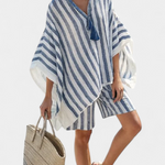 Námořnická svěžest s uvolněným šarmem. Sada Nancy se vyznačuje oversized košilí s pruhy v námořnické modré a bílé barvě, kombinovanou s elegantními šortkami pro letní a bezstarostný vzhled. Detaily jako výstřih se dekorativními třásněmi a textilní zakončení dodávají charakter a lehkost.