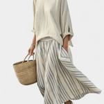 Přirozená a elegantní, souprava Daisy oslavuje středomořskou svěžest s měkkým tričkem s volnými rukávy a vzdušnou midi sukní s pruhy. Vyrobeno z lněného bambusu s jemnou texturou a plynulým střihem, je to ideální volba pro slunečné dny, pobřežní procházky nebo klidné úniky s pohodlným stylem.